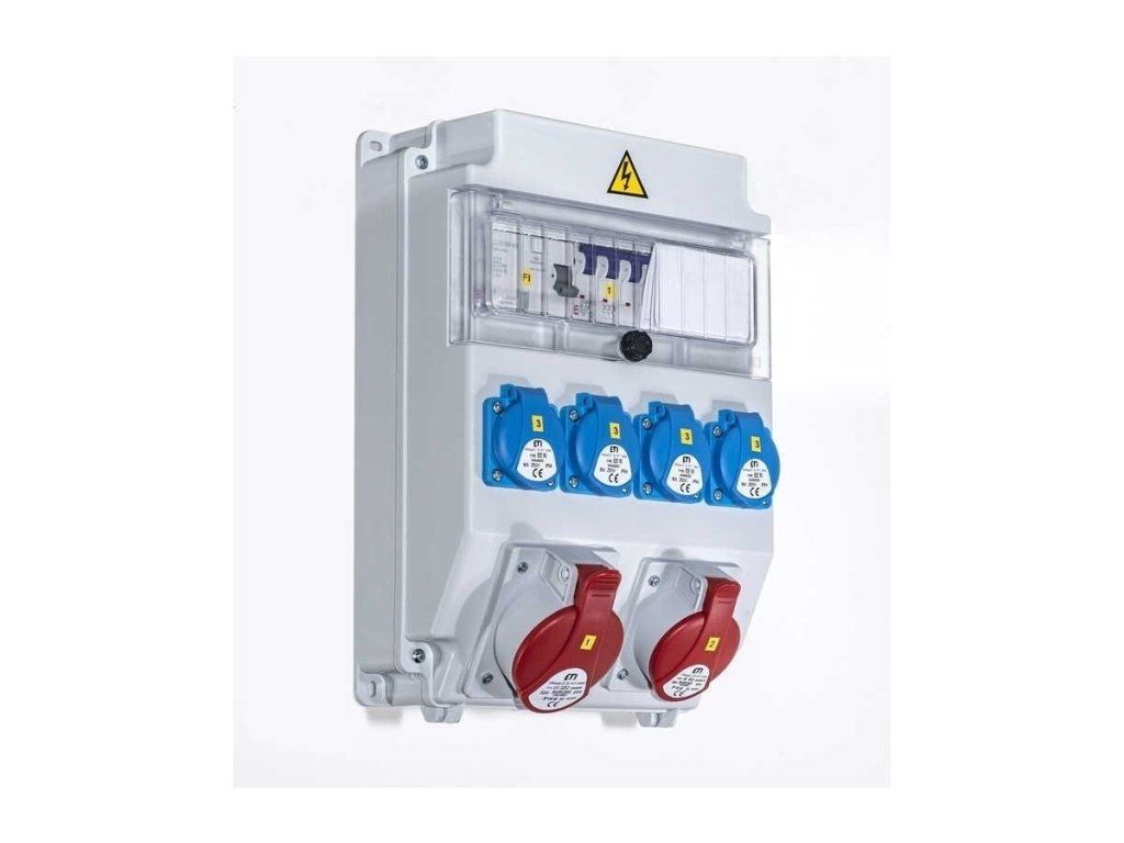 Zásuvková skříň ETI ETI EDS11 4/2 16/32 B 001105414 bez chrániče, je vybavena jištěním 1x ETIMAT P10 1p B16 10kA, 1x ETIMAT P10 3p B16 10kA, 1x ETIMAT P10 3p B32 10kA a 4 zásuvkami.