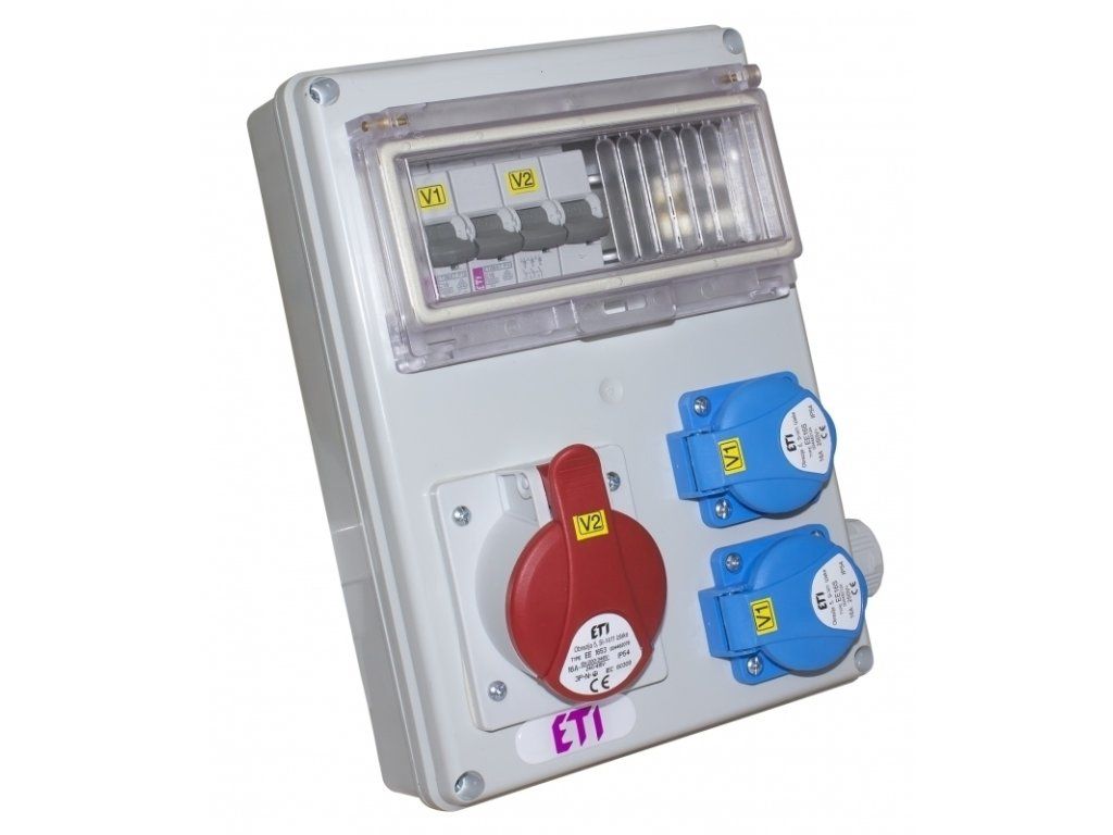 Zásuvková skříň ETI EDS8 RCD 2/1 32 B je vybavena jištěním 1x ETIMAT P10 1p B16 10kA, 1x ETIMAT P10 3p B32 10kA, proudovým chráničem typu A, 2 zásuvkami 230V a 1 zásuvkou CEE 32A 5p.