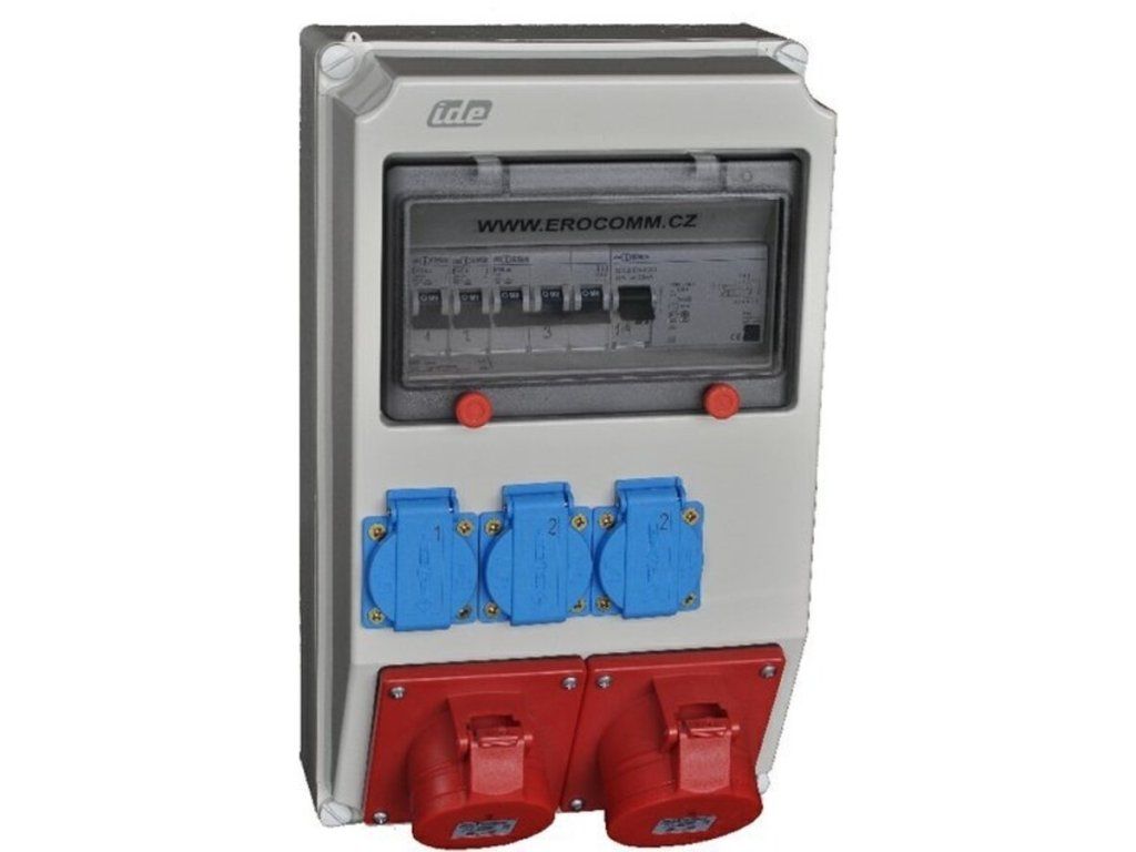 Zásuvková skříň Erocomm Z59.311 DZ se zásuvkami 3x 230V/16A, 1x 400V/16A/5pól, 1x 400V/32A/5pól, jističi 2x 1B16, 1x 3B16 a proudovým chráničem 1x FI 4/40/0,03A typ A. Nástěnná montáž, krytí IP44, zkratová odolnost 6kA.Doplňkové parametry